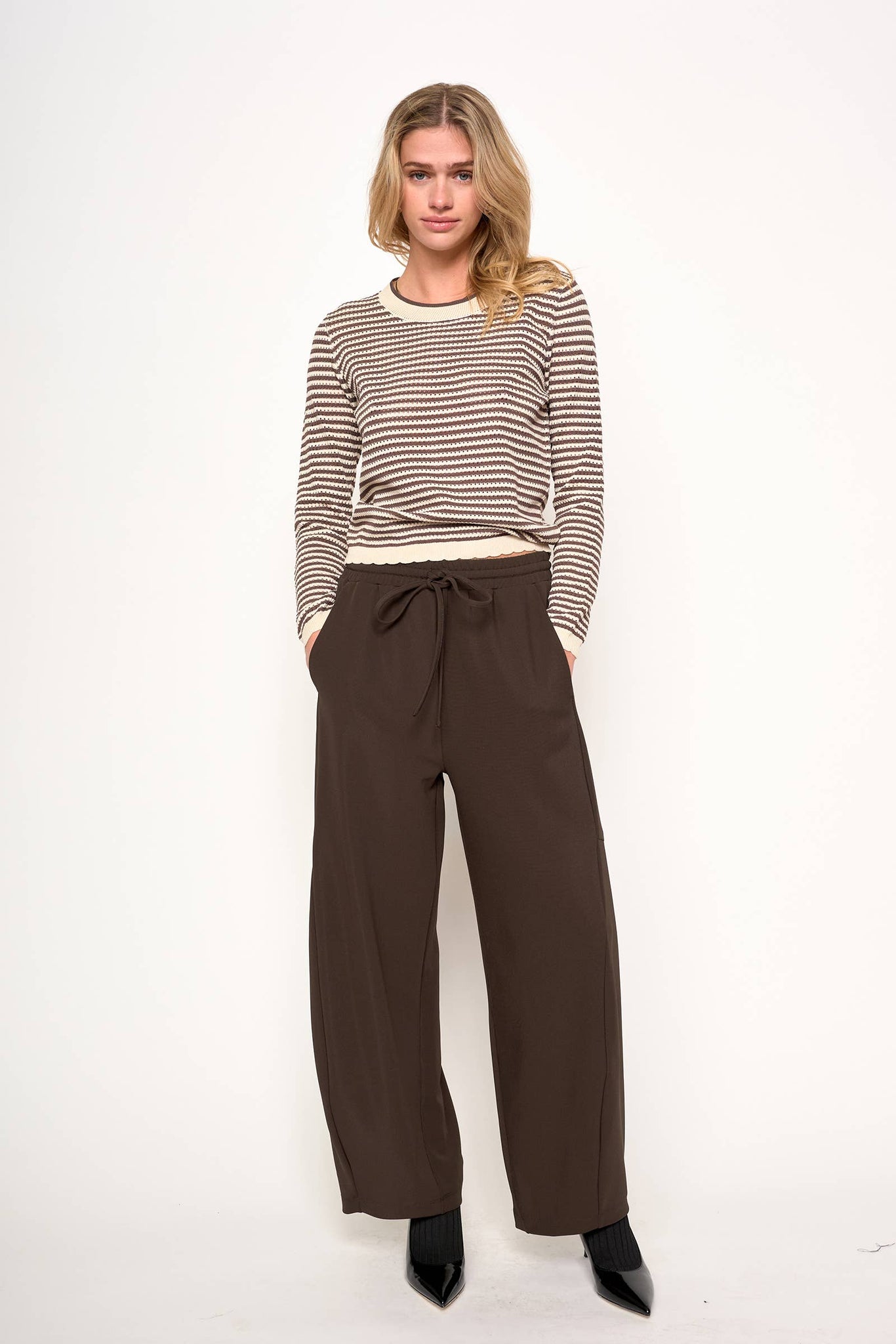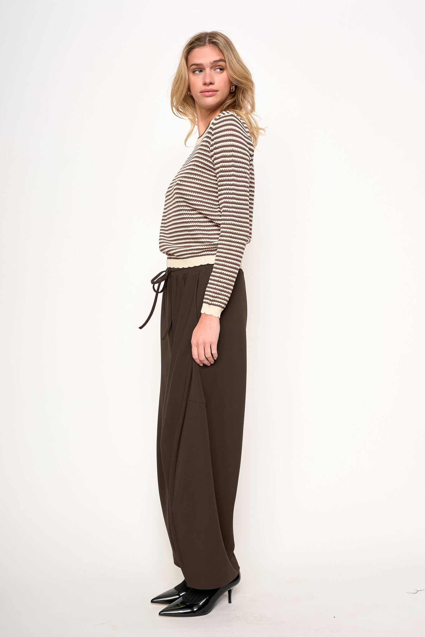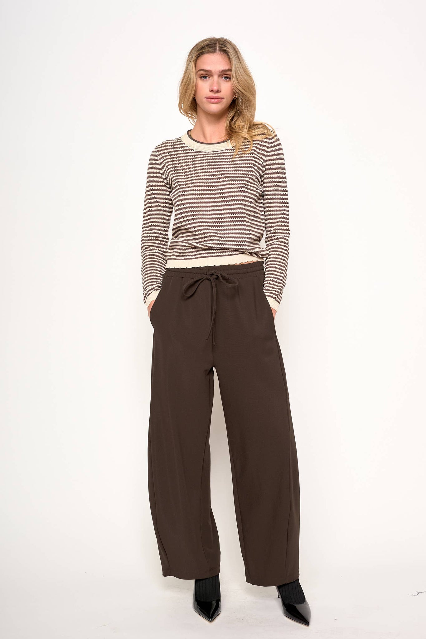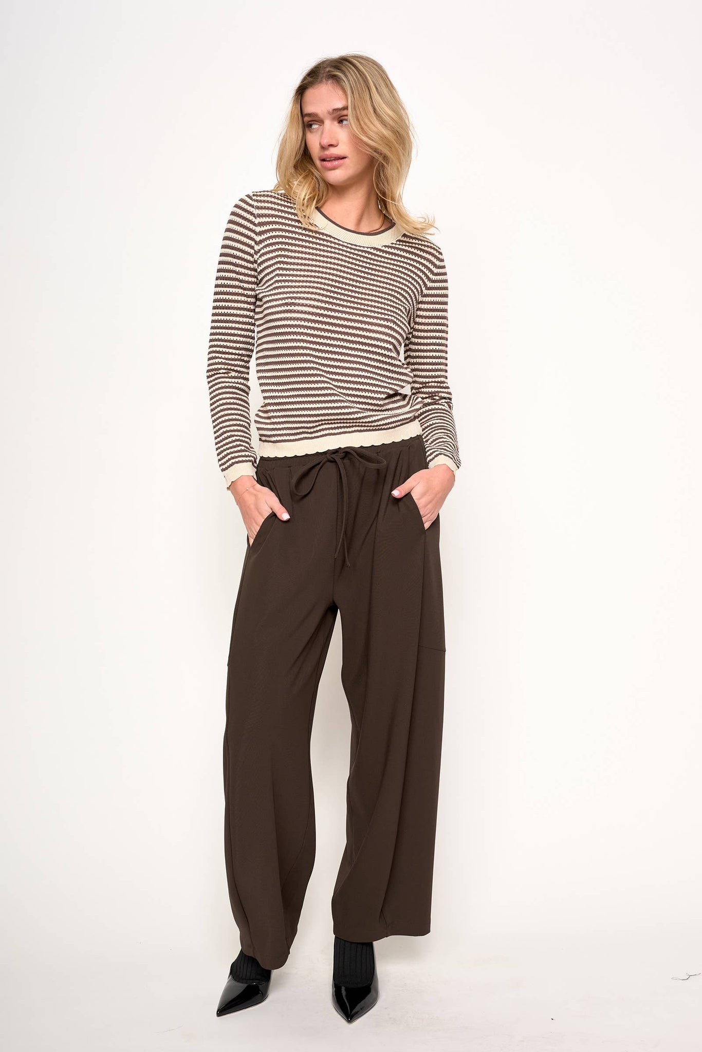 Cozy and stylish, this vintage-inspired striped sweater features a classic Cocoa Ivory stripe with charming scallop edge trim. The contrasting round neckband and sleeve cuffs add a unique touch to this long-sleeve sweater, making it a perfect layering piece for cool weather. Crafted for comfort and timeless appeal, this sweater is ideal for casual outings or relaxed weekends. Embrace retro vibes while staying warm and fashionable with this versatile, vintage-inspired knit.