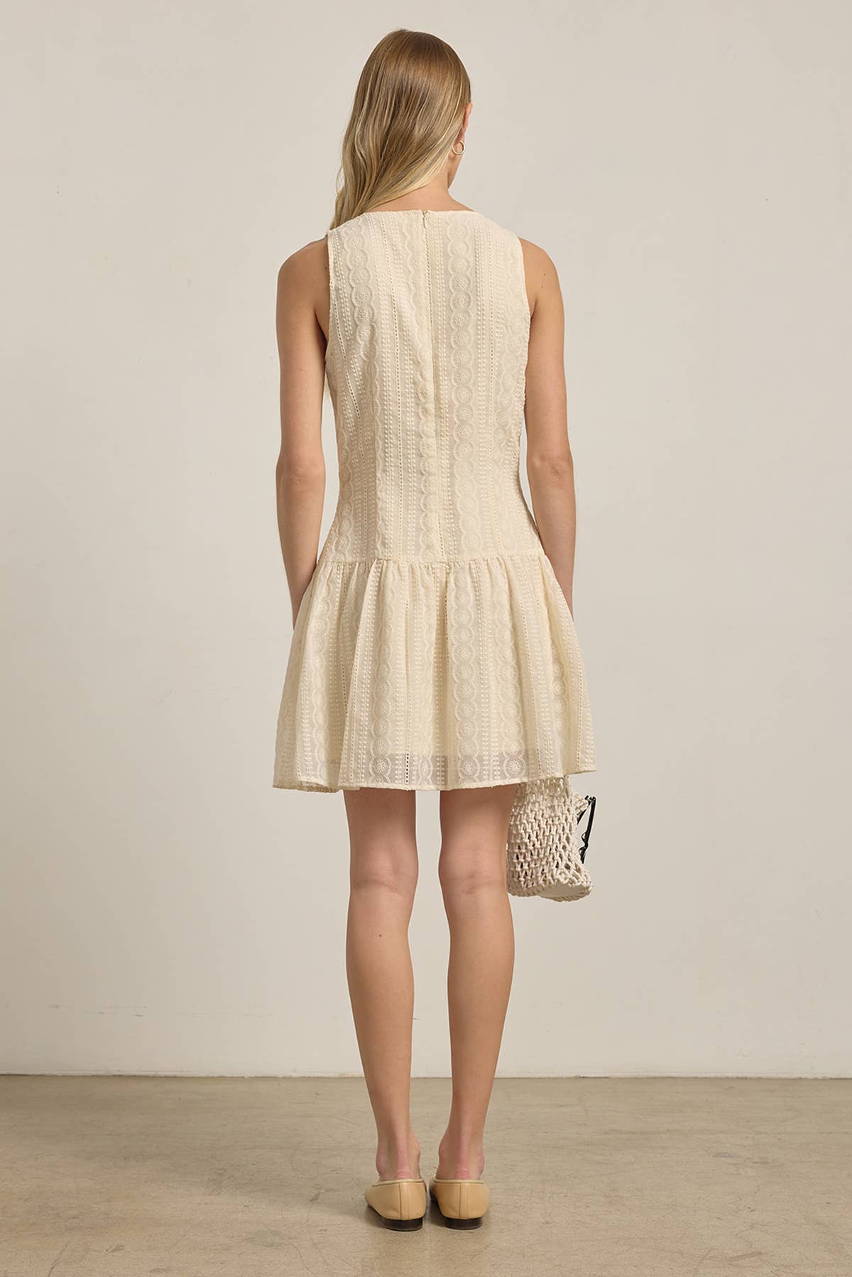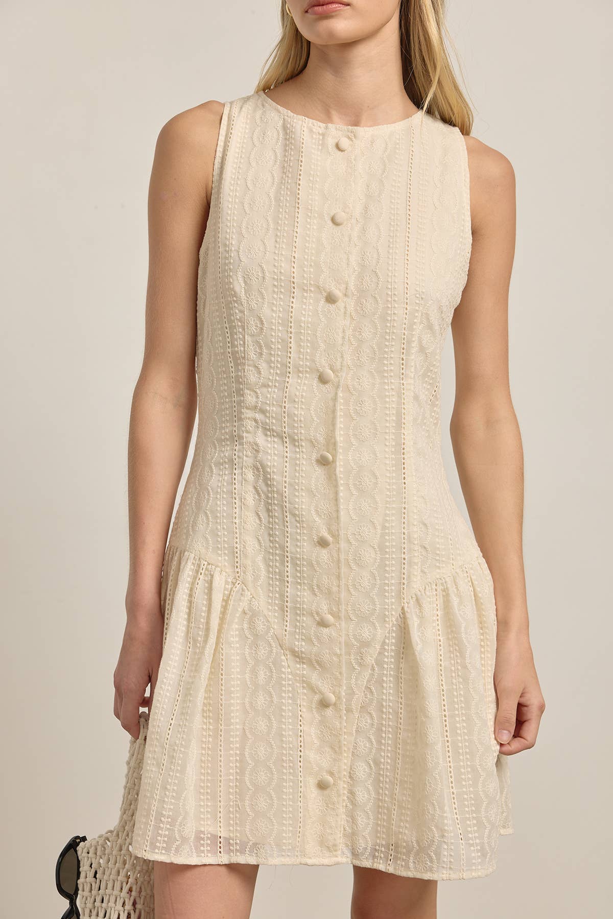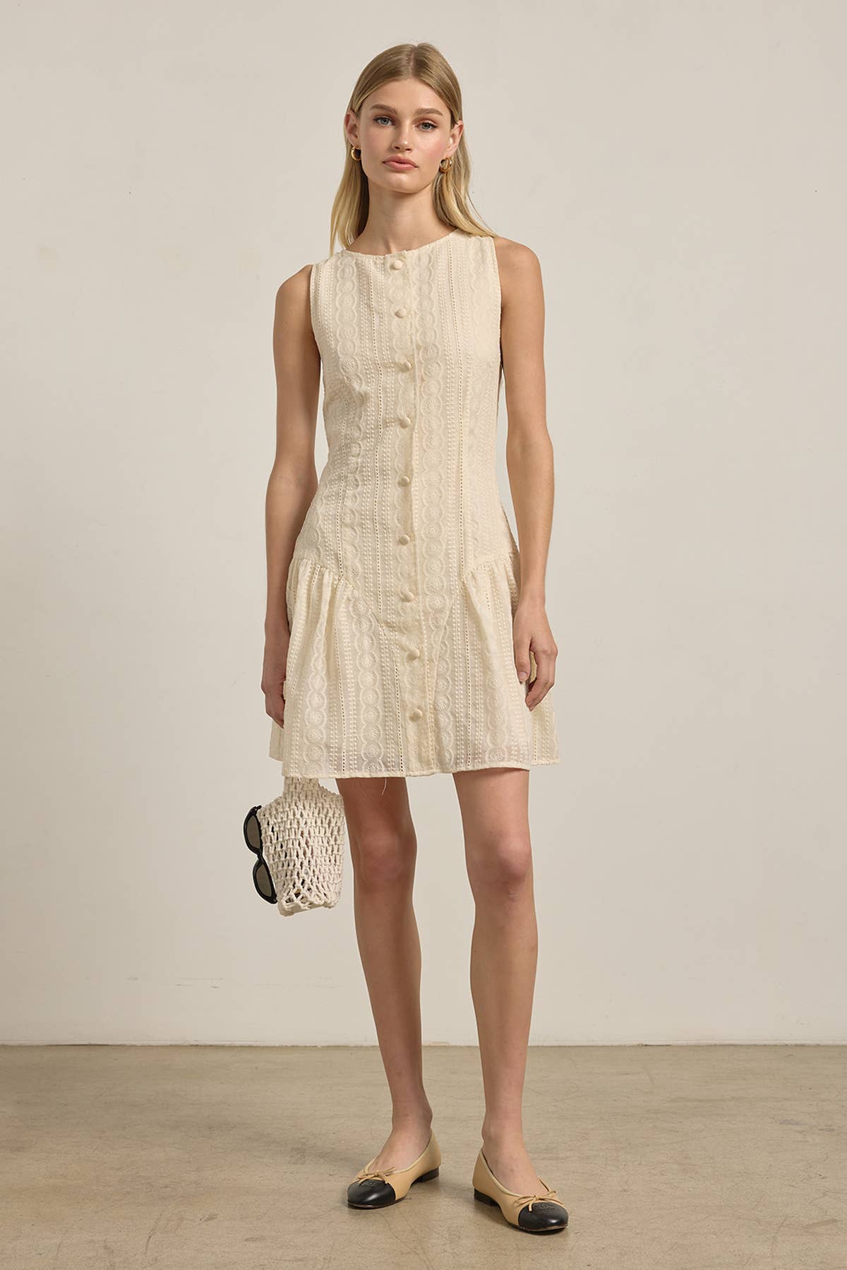 A feminine lace mini dress featuring a flattering fitted bodice and flared hem. Designed with front faux button detailing for a classic touch, a center back zipper closure, and functional side pockets. Fully lined for comfort and coverage, making it the perfect piece for spring and summer occasions.