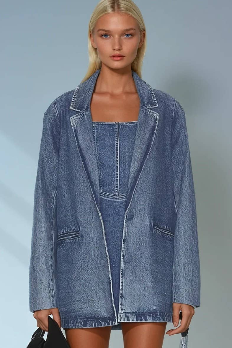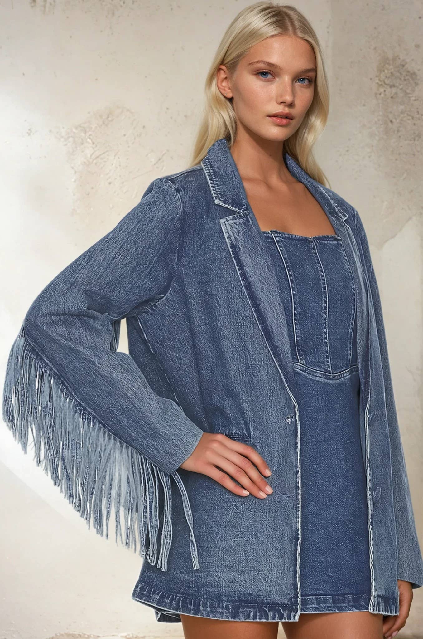 Premium boyfriend fit boho fringed denim blazer with full lining and shoulder pads.