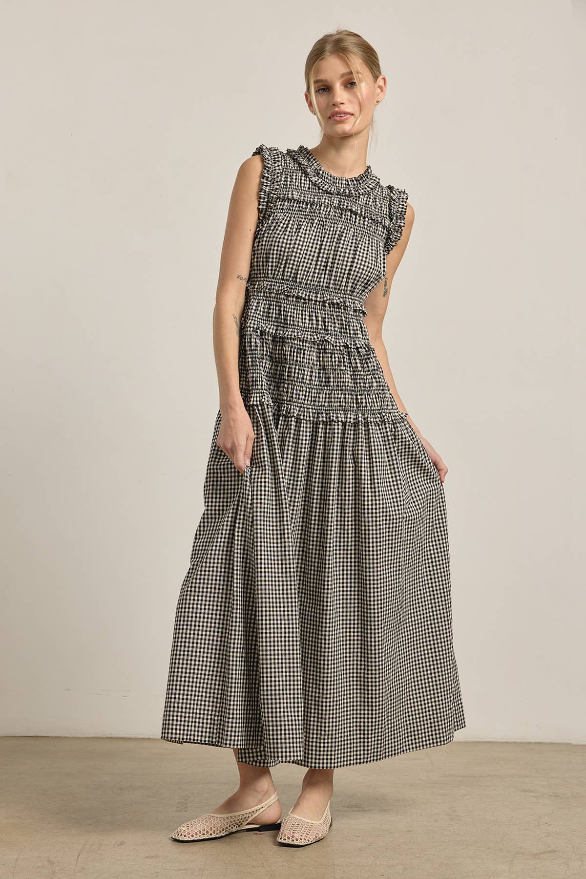 A romantic gingham maxi dress featuring intricate smocking details throughout the bodice and waist for a flattering, feminine silhouette. Designed with soft ruffle trims along the neckline and shoulders, this sleeveless dress offers an effortlessly chic look perfect for spring to fall.